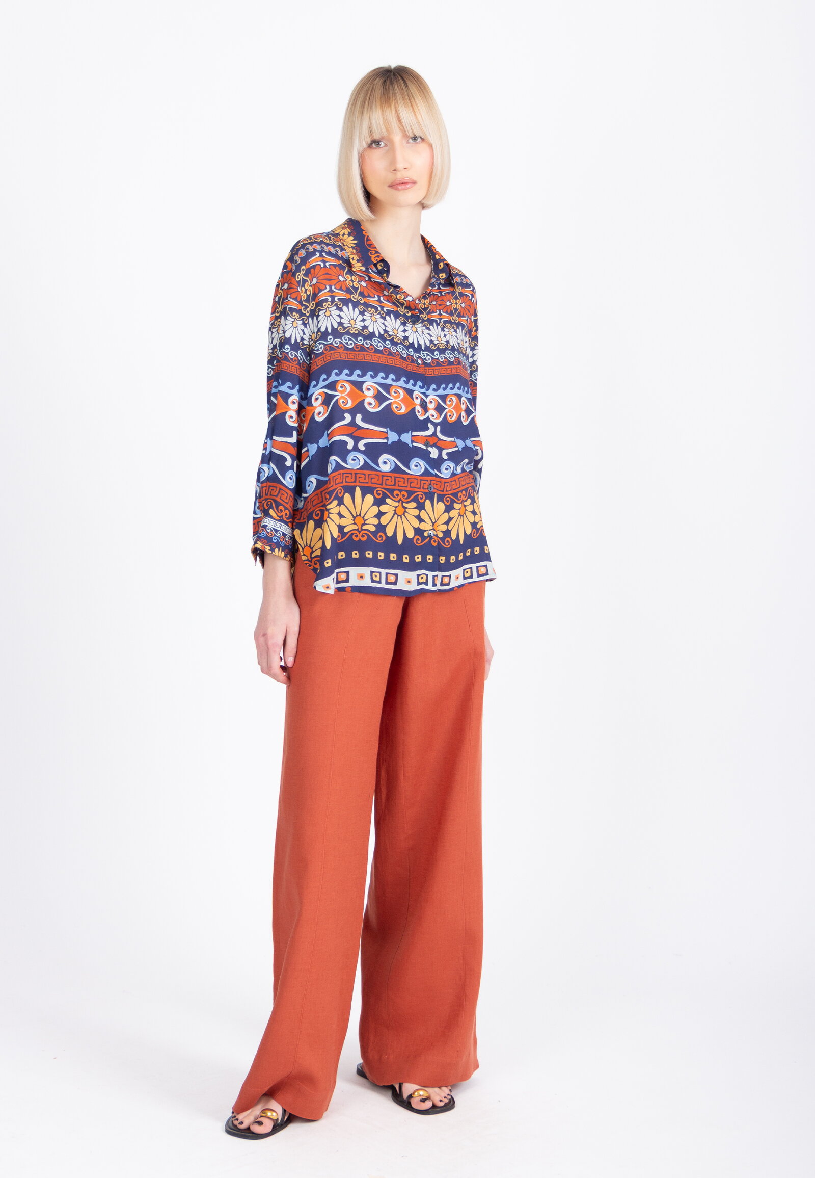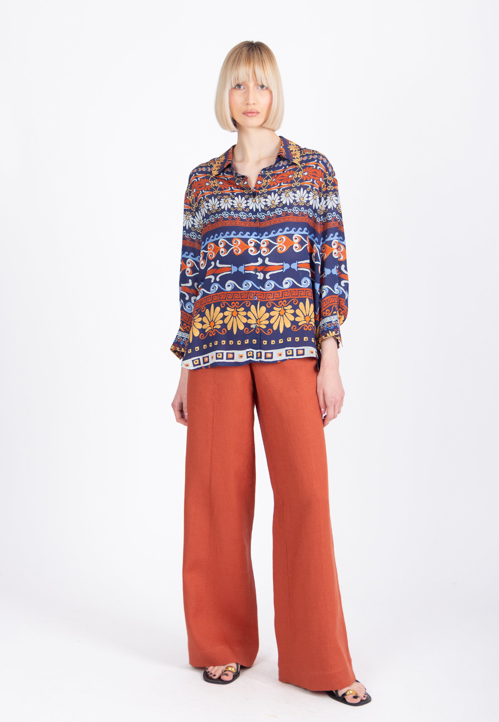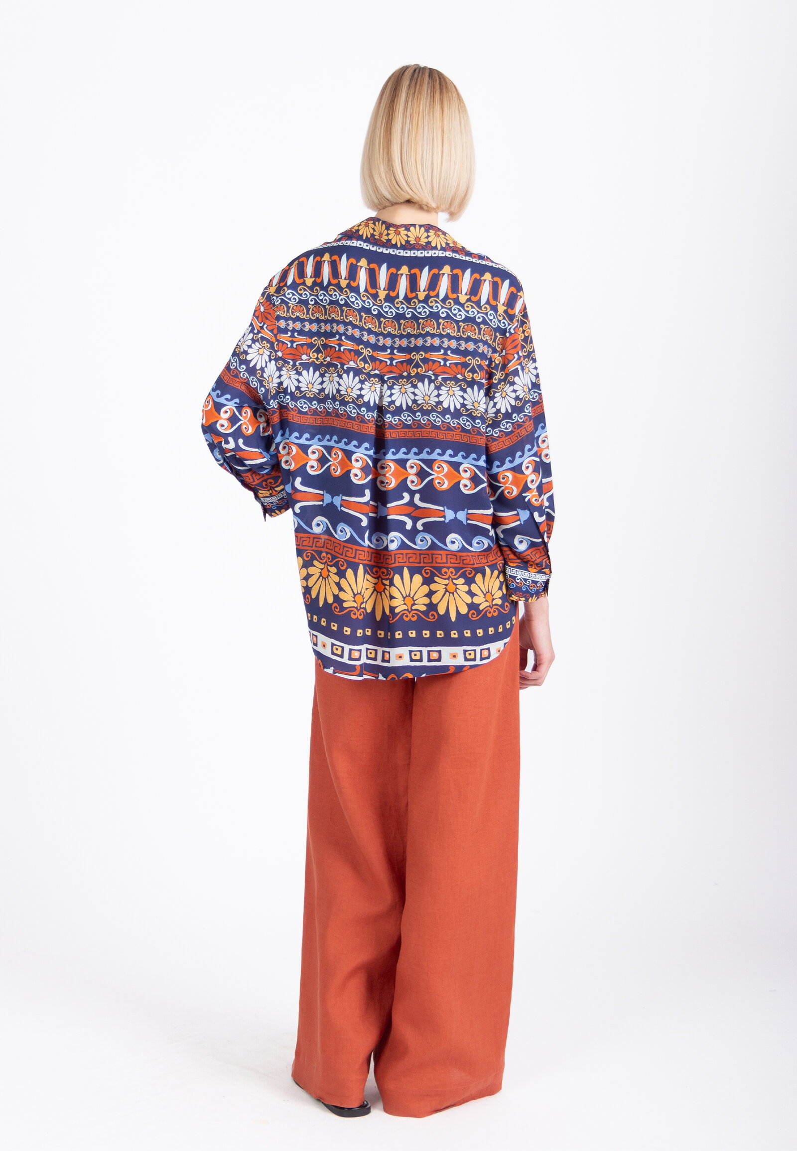An oversized printed shirt knitted from pure viscose by IVKO Woman, with Mediterranean-inspired coastal motifs. The relaxed silhouette and colourful design create a versatile artistic layer. Viscose for smooth, flowing comfort.