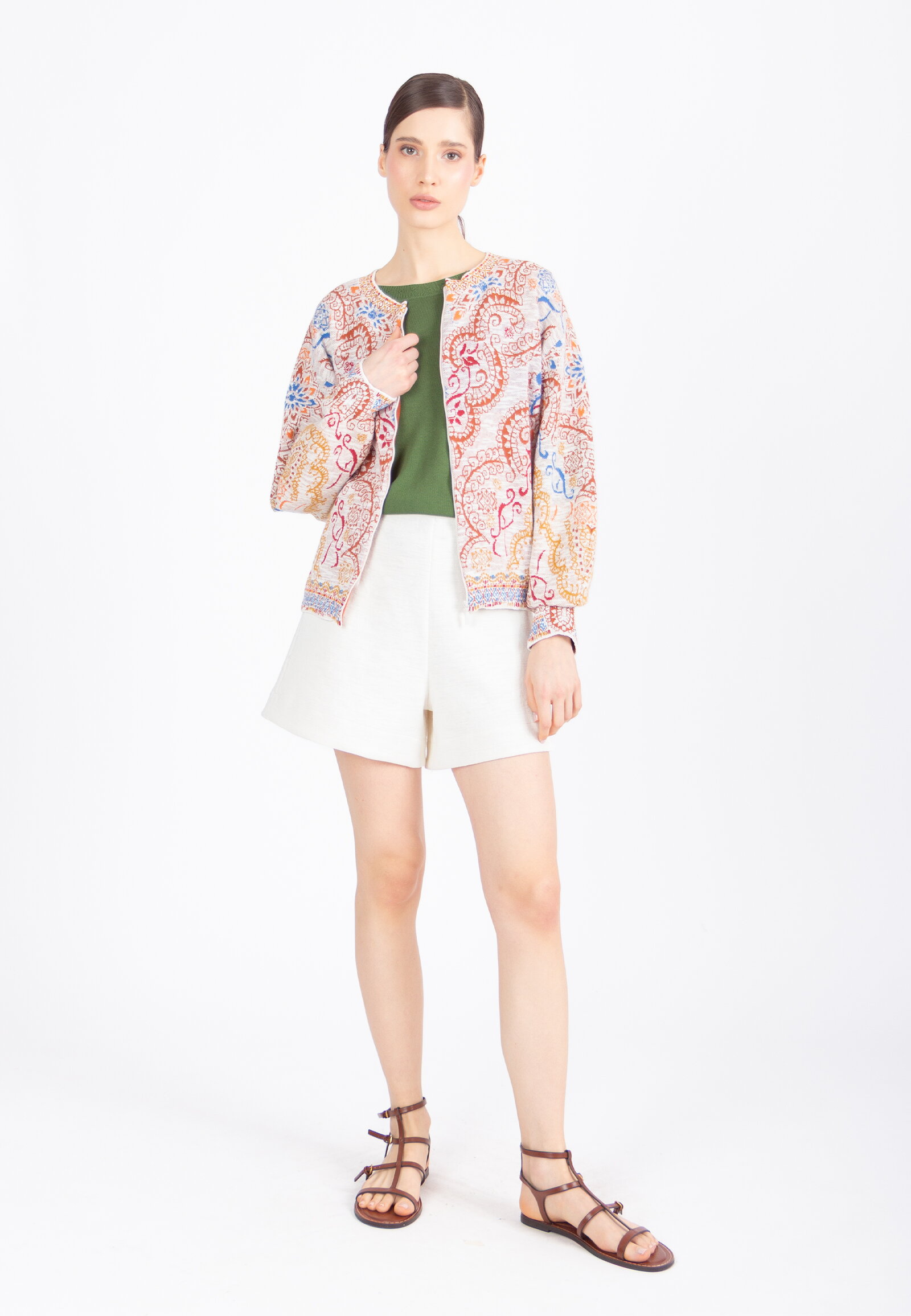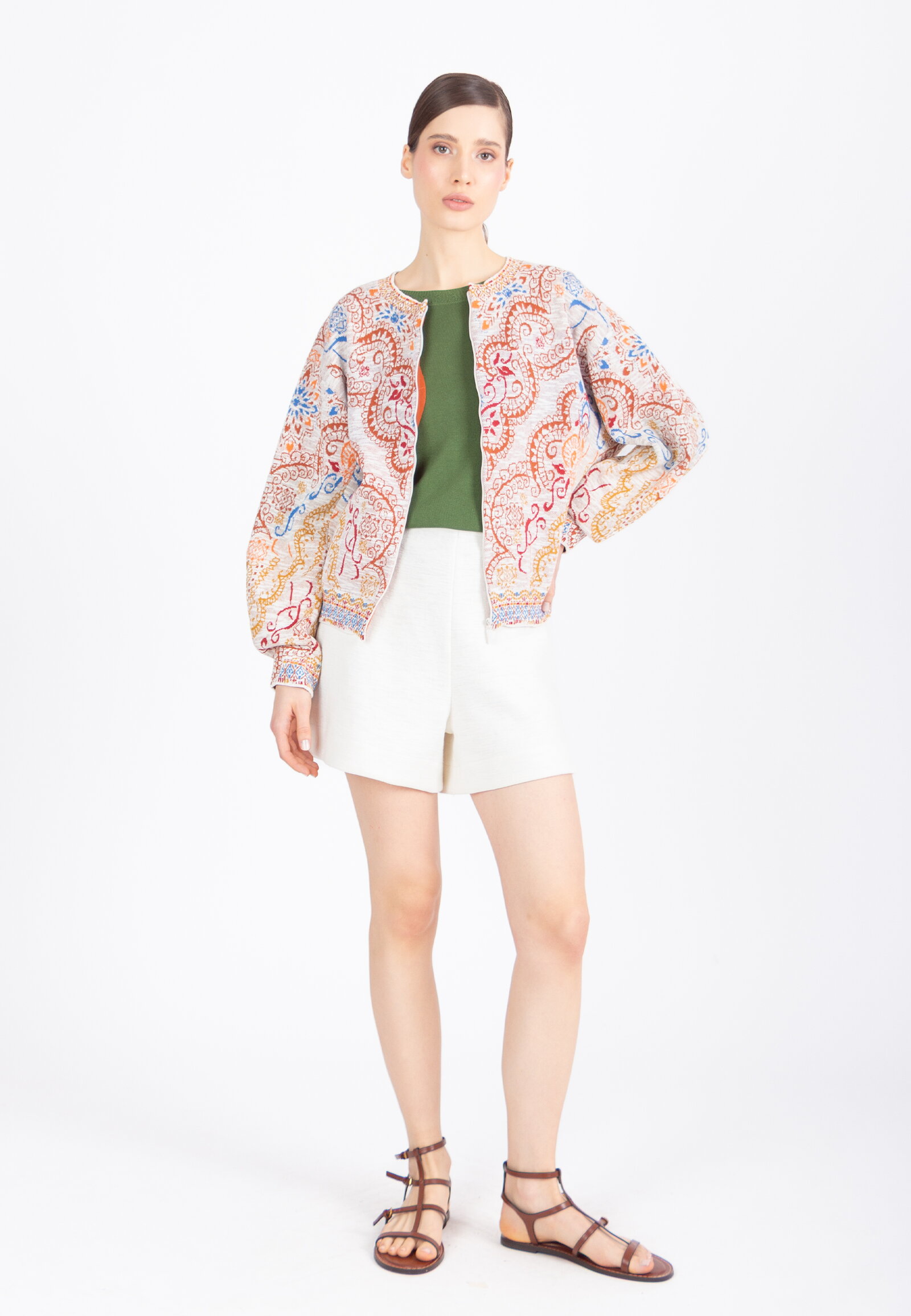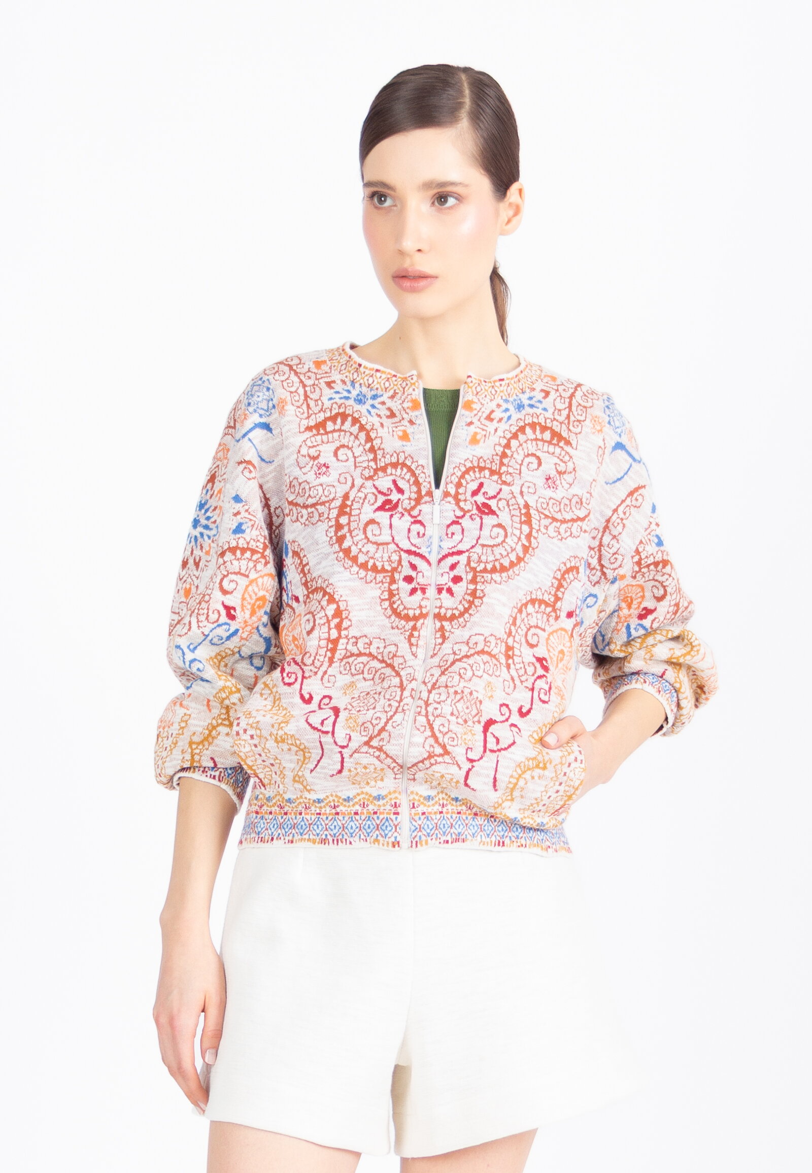 A sleeveless bomber jacket knitted from cotton with elastane by IVKO Woman, with a richly detailed ornament pattern. Sporty silhouette meets heritage-inspired design for an exciting contrast. Elastane adds gentle stretch.