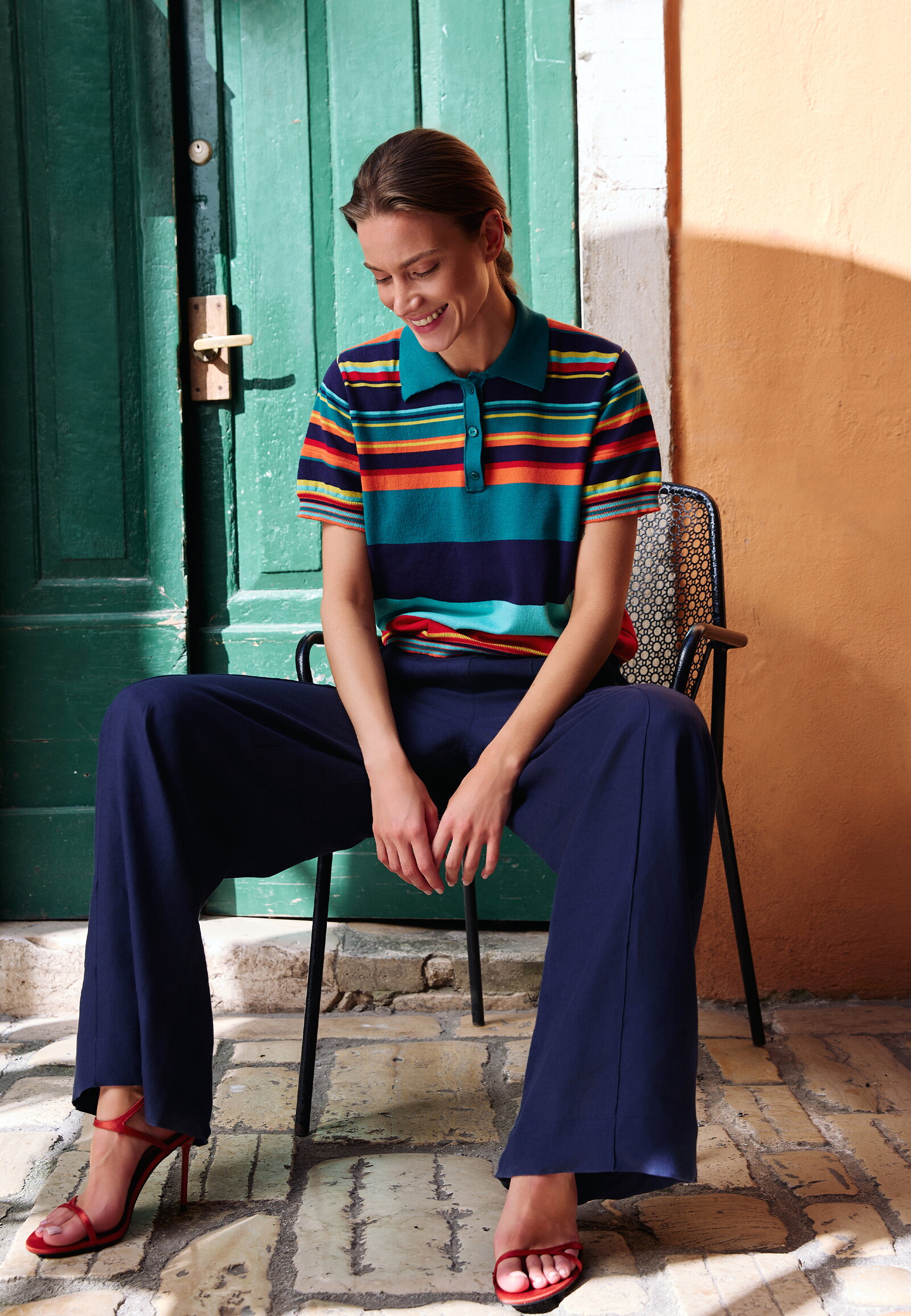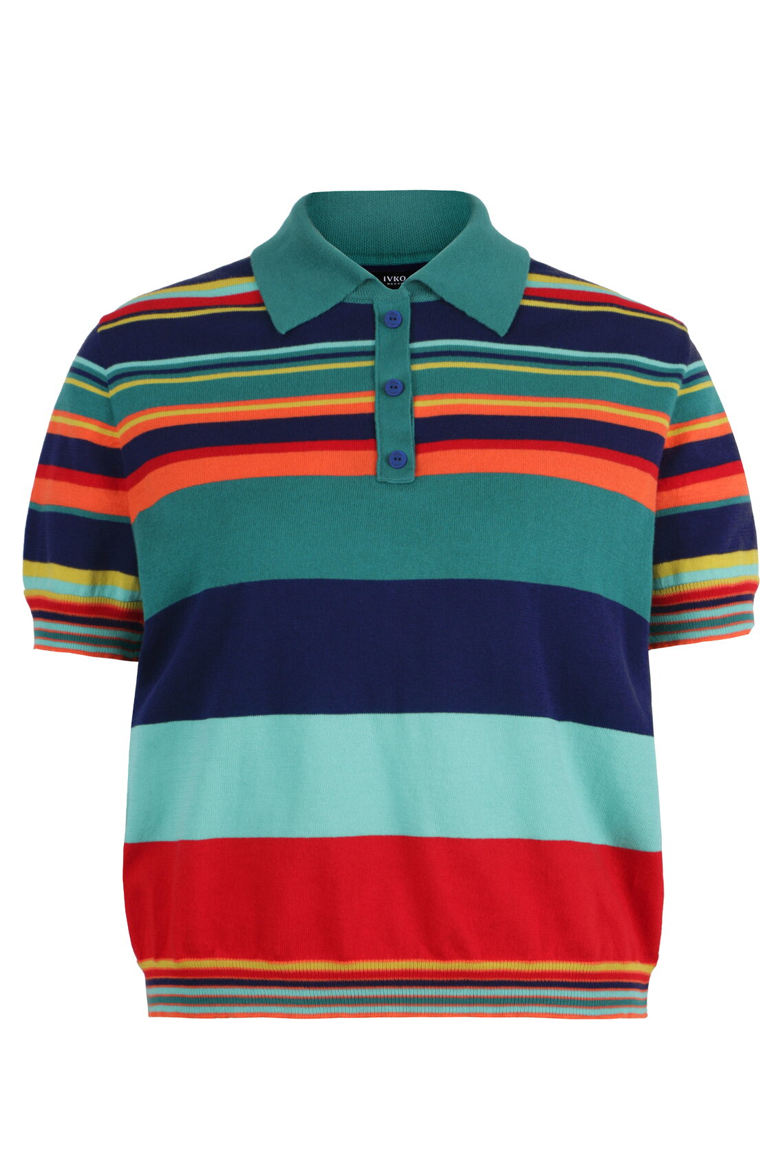 A short-sleeve jacquard pullover knitted from pure cotton by IVKO Woman, with bold horizontal stripes and a polo collar. Colour and knitting technique create a sporty yet refined summer piece. Cotton for everyday comfort.