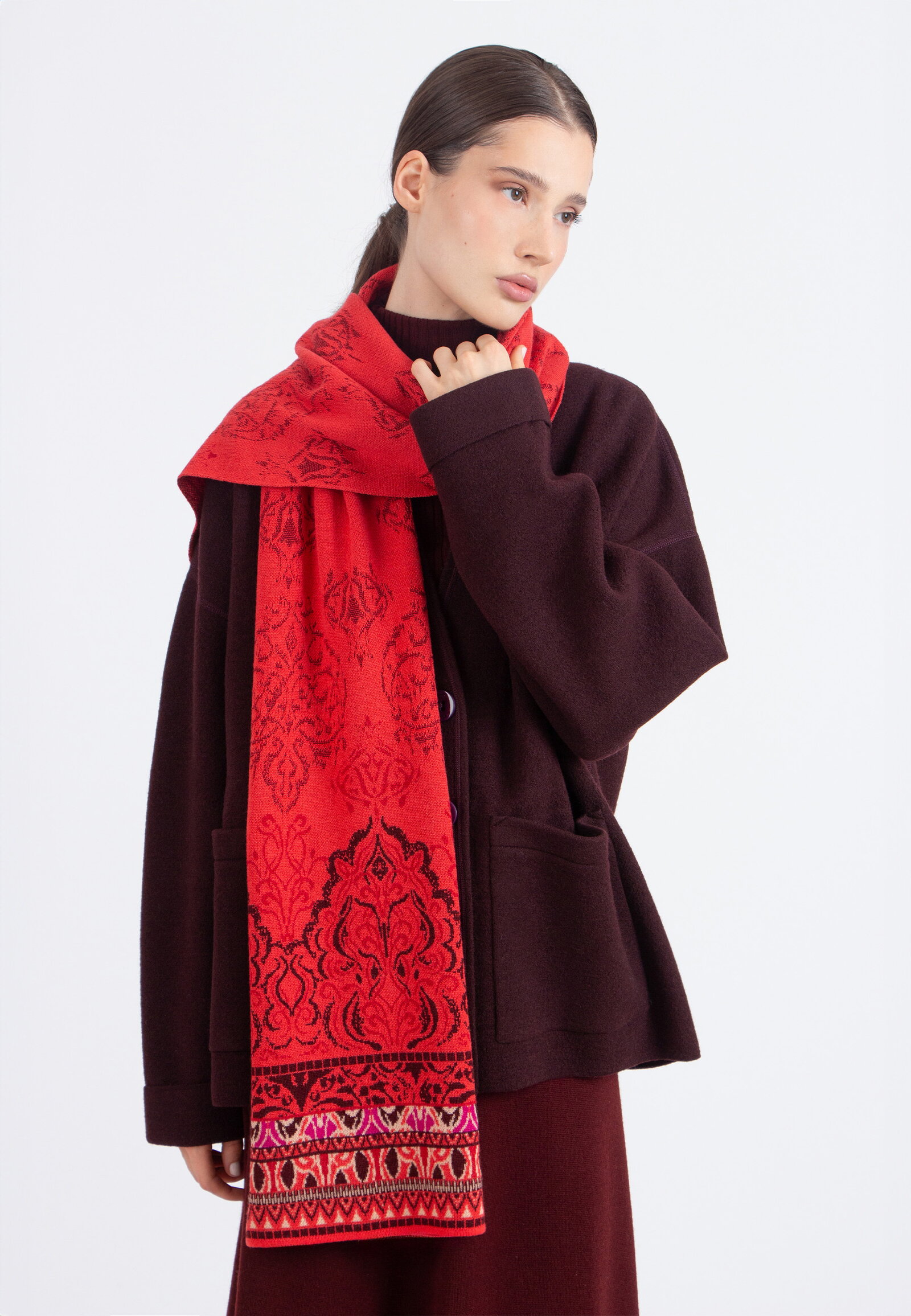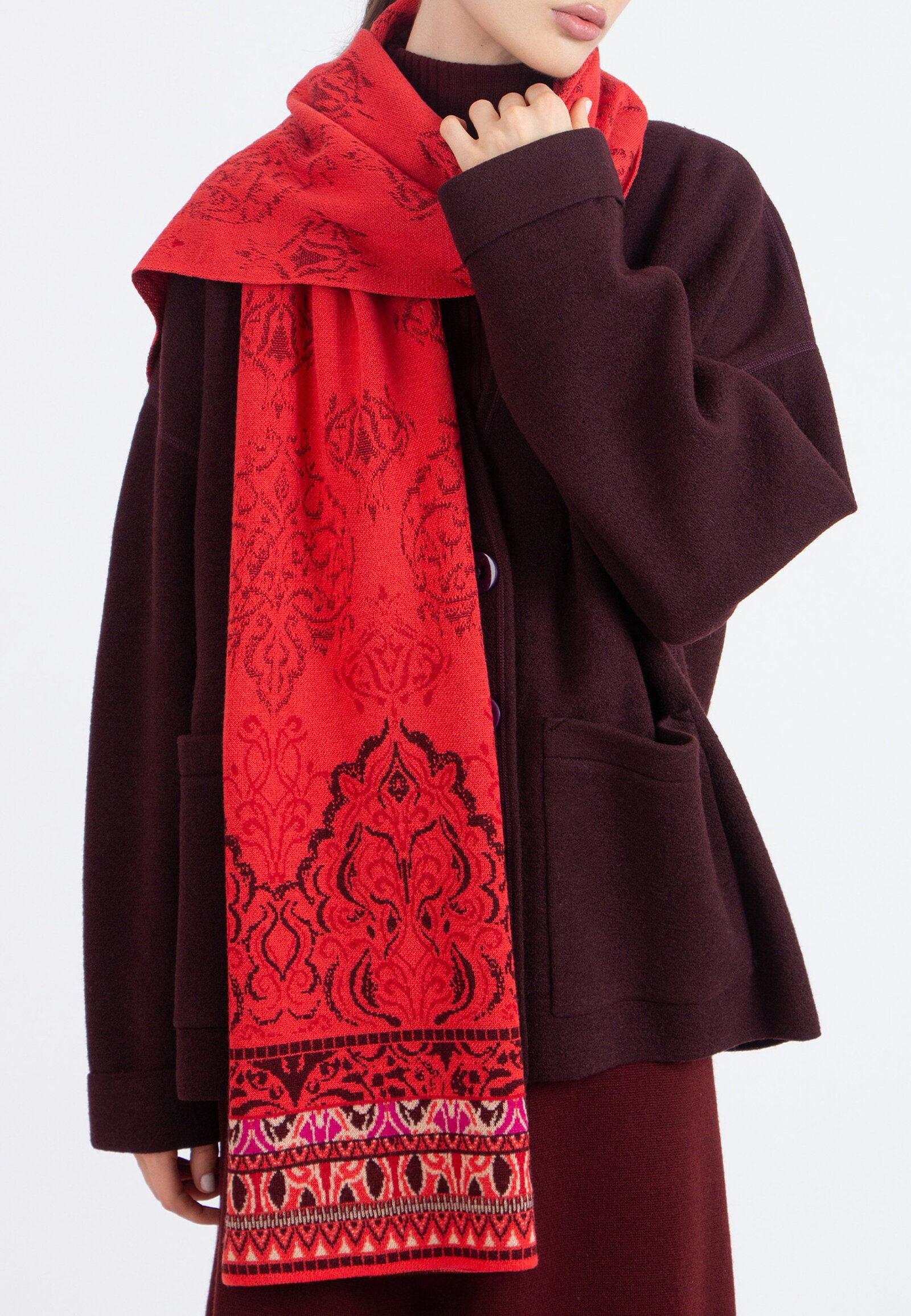 Wollschal mit Ornament-Motiv. Das ausdrucksstarke Muster und die markante Struktur verleihen dem Accessoire eine starke visuelle Präsenz für den Winter.